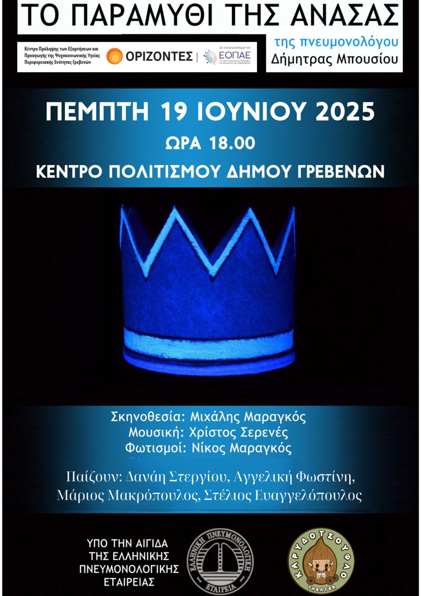 Το Κέντρο Πρόληψης «ΟΡΙΖΟΝΤΕΣ» Π.Ε Γρεβενών σε συνεργασία με τον Εθνικό Οργανισμό Πρόληψης και Αντιμετώπισης των Εξαρτήσεων (ΕΟΠΑΕ) , Την Πέμπτη 19/6/2025, 6.00 το απόγευμα διοργανώνει την παρουσίαση της θεατρικής παράστασης, «Το Παραμύθι της Ανάσας» , στο Πολιτιστικό Κέντρο Γρεβενών.