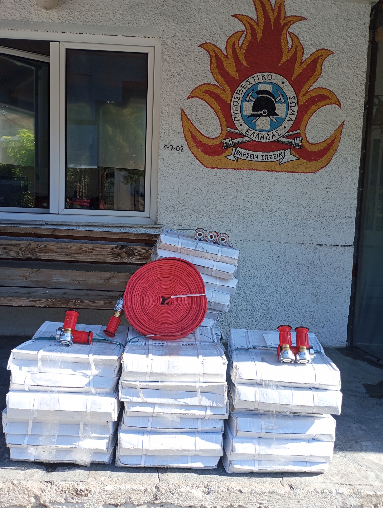 - 30 σωλήνες πυρόσβεσης, χρώματος κόκκινου, τριών στρώσεων, διαμέτρου 1” (0,025m) και μήκους 25 μέτρων έκαστος, με ταχυσυνδέσμους αλουμινίου τύπου Storz