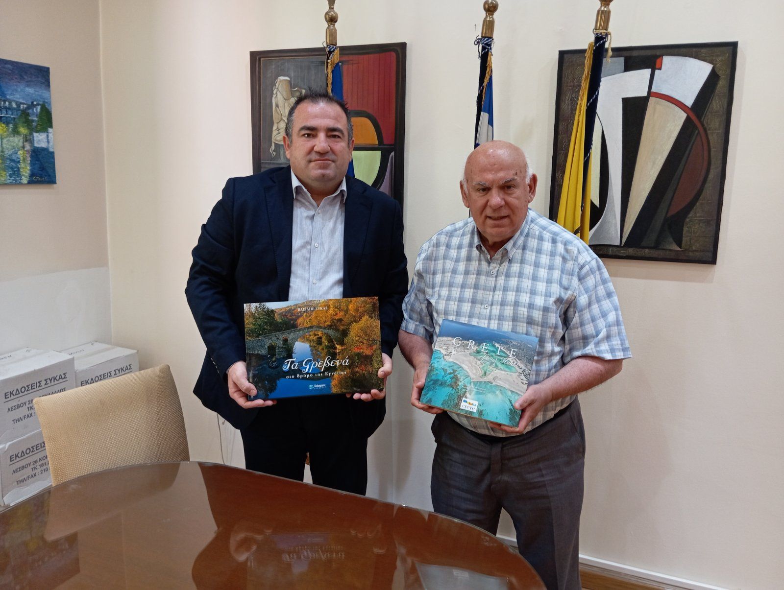 Τον ειδικό συνεργάτη του Περιφερειάρχη Κρήτης σε θέματα μαρτυρικών χωριών, κ. Νικόλαο Μπιμπάκη, υποδέχθηκε στο γραφείο του ο Αντιπεριφερειάρχης Γρεβενών, Κυριάκος Ταταρίδης. Η συνάντηση πραγματοποιήθηκε με αφορμή τις καθιερωμένες εκδηλώσεις τιμής και μνήμης που διοργανώνονται κάθε χρόνο στα μαρτυρικά χωριά της περιοχής, αποτίοντας φόρο τιμής στα αθώα θύματα της ναζιστικής θηριωδίας κατά τη διάρκεια του Β’ Παγκοσμίου Πολέμου.