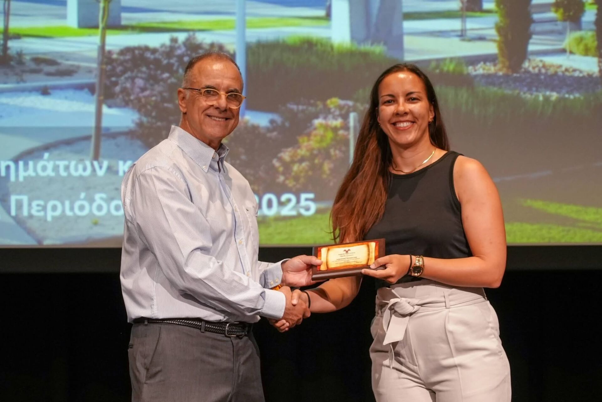 Ανάμεσα στους βραβευθέντες ήταν και η Λαμπρινή Παπαργύρη, υποψήφια διδάκτορας του Τμήματος Πολιτικών Μηχανικών και Μηχανικών Περιβάλλοντος, η οποία ολοκληρώνει τις σπουδές της αυτόν τον μήνα. Κοζανίτισσα με καταγωγή από τα Γρεβενά, η κα Παπαργύρη τιμήθηκε για την πολυετή της προσήλωση στην επιστήμη και τον αθλητισμό, αποτελώντας πρότυπο για τη νέα γενιά. Παράλληλα, δραστηριοποιείται ως υπεύθυνη έργου στο ευρωπαϊκό πρόγραμμα “Smart Start 4 Dual Careers”, εκπροσωπώντας την Κύπρο στο πλαίσιο του διακρατικού διαλόγου για την υποστήριξη των διπλών σταδιοδρομιών των αθλητών.