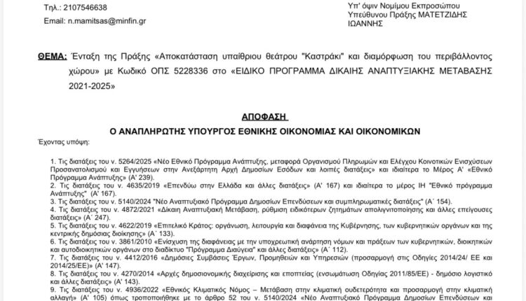 Ένταξη της αποκατάστασης του υπαίθριου θεάτρου «Καστράκι» στο Ειδικό Πρόγραμμα Δίκαιης Αναπτυξιακής Μετάβασης