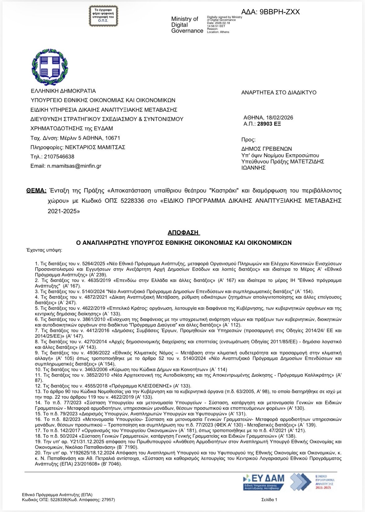 Με ιδιαίτερη ικανοποίηση ανακοινώνουμε την ένταξη της Πράξης «Αποκατάσταση υπαίθριου θεάτρου “Καστράκι” και διαμόρφωση του περιβάλλοντος χώρου» στο Ειδικό Πρόγραμμα Δίκαιης Αναπτυξιακής Μετάβασης 2021–2025.