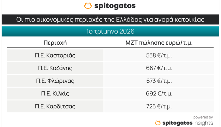 Στον αντίποδα, οι πιο οικονομικές περιοχές της χώρας για αγορά κατοικίας είναι οι εξής: η Π.Ε. Καστοριάς με ΜΖΤ πώλησης στα 538 ευρώ/τ.μ., η Π.Ε. Κοζάνης, η Π.Ε. Φλώρινας, η Π.Ε. Κιλκίς και η Π.Ε. Καρδίτσας.