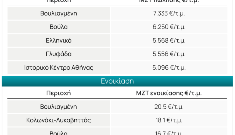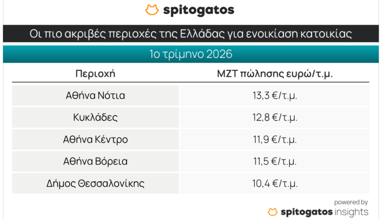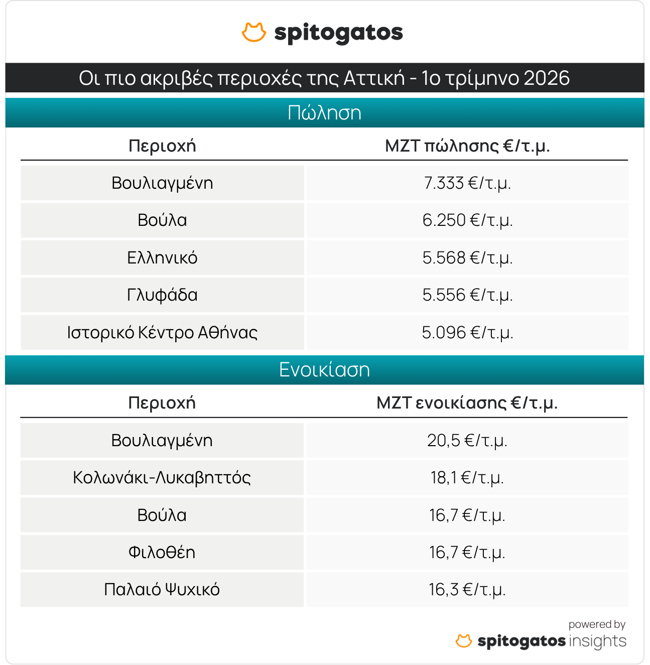 Το Spitogatos Insights εξέτασε την εξέλιξη των ΜΖΤ πώλησης και ενοικίασης κατοικιών στην Αττική κατά το 1ο τρίμηνο του 2026. Σύμφωνα με τα πρόσφατα στοιχεία, τα Νότια Προάστια σχεδόν μονοπωλούν το top 5 των πιο ακριβών περιοχών της Αττικής, με τη Βουλιαγμένη να βρίσκεται στην κορυφή με ΜΖΤ 7.333 ευρώ/τ.μ., ενώ ακολουθούν η Βούλα, το Ελληνικό, η Γλυφάδα και το Ιστορικό Κέντρο της Αθήνας, όπως φαίνεται στον παρακάτω πίνακα.