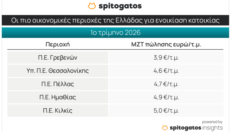 Σε ό,τι αφορά την ενοικίαση κατοικίας, οι πιο οικονομικές περιοχές της χώρας για το 1ο τρίμηνο του 2026 αναδεικνύονται η Π.Ε. Γρεβενών με ΜΖΤ ενοικίασης στα 3,9 ευρώ/τ.μ., ενώ ακολουθούν το υπόλοιπο της Π.Ε. Θεσσαλονίκης, η Π.Ε. Πέλλας, η Π.Ε. Ημαθίας και η Π.Ε. Κιλκίς.