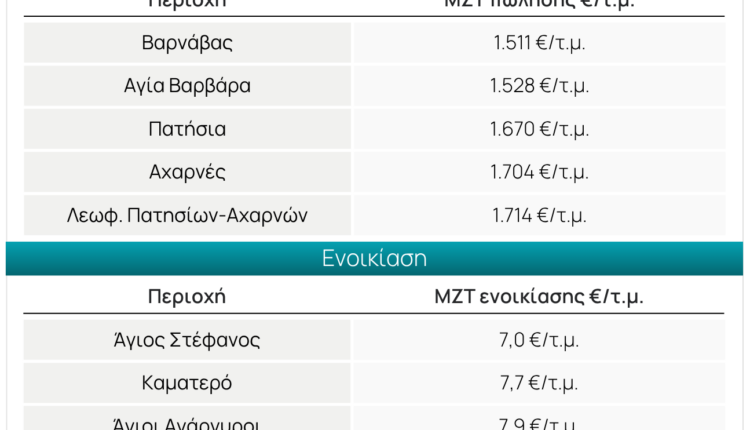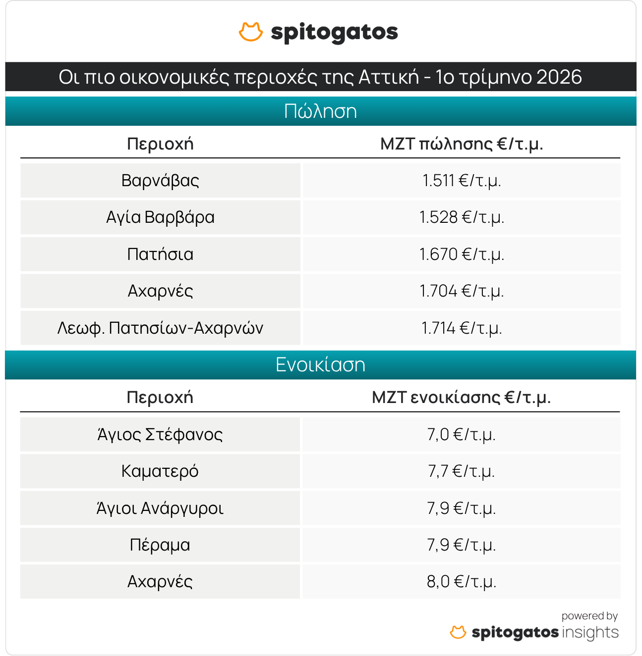 Στις πιο οικονομικές περιοχές της Αττικής για αγορά κατοικίας βρίσκεται ο Βαρνάβας με ΜΖΤ πώλησης στα 1.511 ευρώ/τ.μ., ενώ ακολουθούν η Αγία Βαρβάρα, τα Πατήσια, οι Αχαρνές και η περιοχή Λεωφόρος Πατησίων-Αχαρνών.