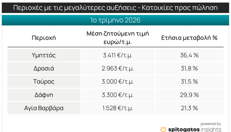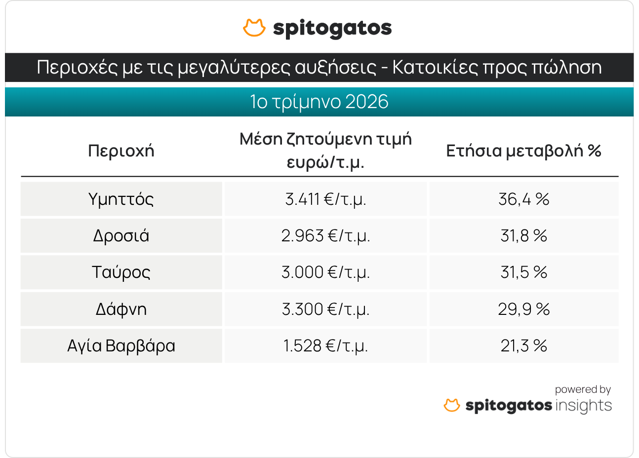 Οι περιοχές που ξεχώρισαν κατά το 1ο τρίμηνο του 2026 για τις σημαντικές αυξήσεις που σημείωσαν στη ΜΖΤ πώλησης κατοικίας σε σχέση με το αντίστοιχο τρίμηνο του 2025 είναι η περιοχή του Υμηττού, ενώ ακολουθούν η Δροσιά, ο Ταύρος, η Δάφνη και η Αγία Βαρβάρα.
