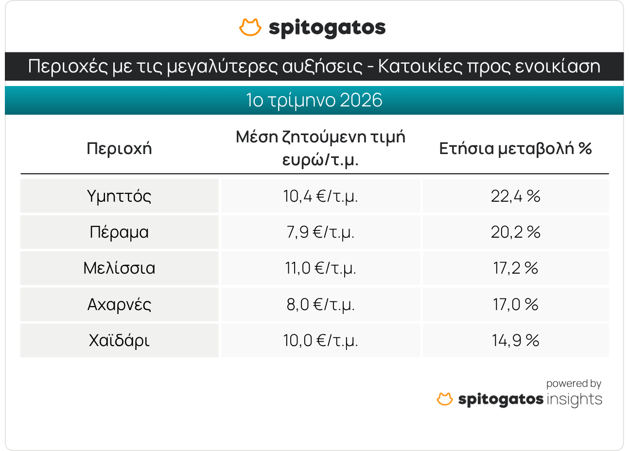 Οι σημαντικές ετήσιες αυξήσεις που σημειώνονται στις ζητούμενες τιμές πώλησης σε Ταύρο και Δάφνη, καθώς και στις ζητούμενες τιμές ενοικίασης σε Πέραμα, Αχαρνές και Χαϊδάρι, υπογραμμίζουν το αυξανόμενο ενδιαφέρον αυτών που αναζητούν κατοικία  — είτε προς πώληση είτε προς ενοικίαση — σε λιγότερο δημοφιλείς αλλά πιο οικονομικά προσιτές περιοχές.