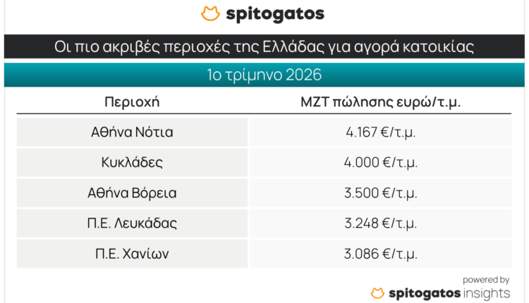 Τα Νότια Προάστια και οι Κυκλάδες συνεχίζουν να καταλαμβάνουν τις πρώτες θέσεις στην κατάταξη των πιο ακριβών περιοχών της χώρας για αγορά κατοικίας, με ΜΖΤ πώλησης κατοικίας 4.167 ευρώ/τ.μ. και 4.000 ευρώ/τ.μ. αντίστοιχα, ενώ ακολουθούν τα Βόρεια Προάστια, η Περιφερειακή Ενότητα (Π.Ε.) Λευκάδας και η Π.Ε. Χανίων.