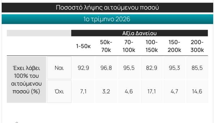Αντίθετα, μεγαλύτερη απόκλιση μεταξύ αιτούμενου και τελικά εγκριθέντος ποσού εμφανίζεται στις κατηγορίες 100.000-150.000 ευρώ, όπου το 17,1% δεν έλαβε το σύνολο του ποσού που ζήτησε, και 200.000-300.000 ευρώ, με αντίστοιχο ποσοστό 14,6%.
