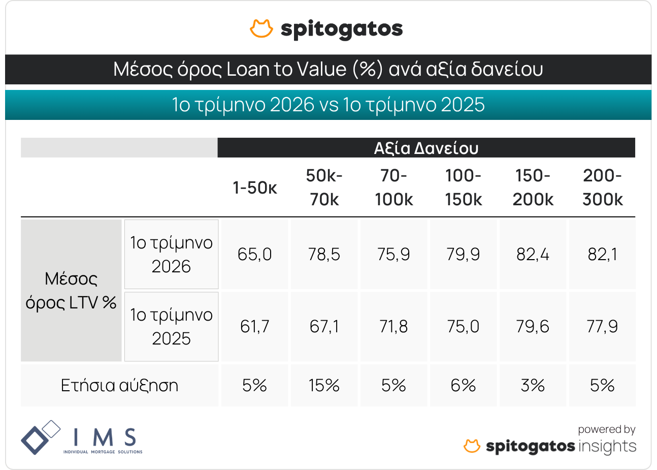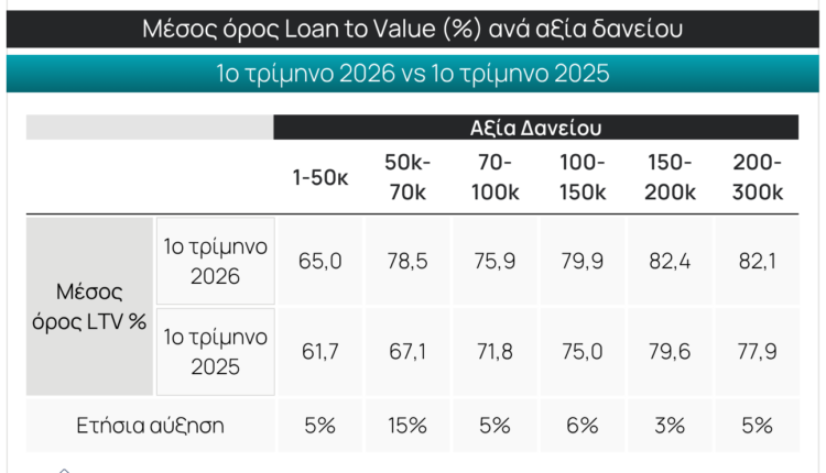 Είναι σημαντικό να σημειωθεί ότι ο δείκτης LTV είναι αυξημένος κατά το 1ο τρίμηνο του 2026 σε όλες τις βαθμίδες αξίας δανείου, με τη σημαντικότερη αύξηση να σημειώνεται στη βαθμίδα 50-70 χιλιάδες ευρώ.