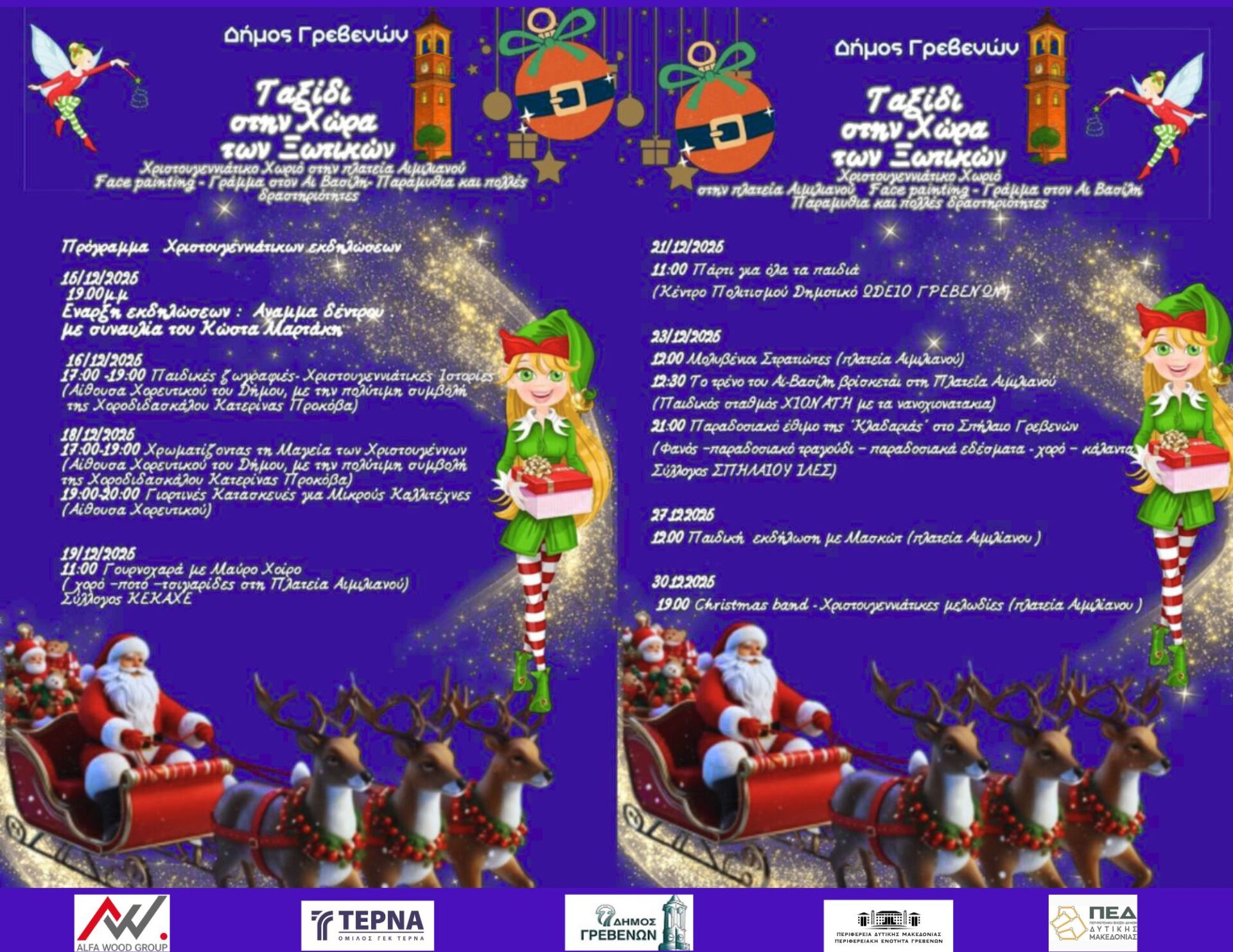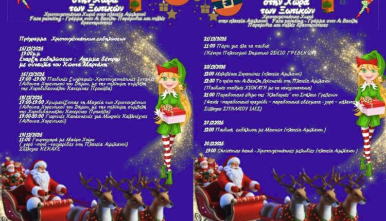 Φέτος τα Γρεβενά πλημμυρίζουν φως και προσμονή, ανοίγοντας την πιο λαμπερή σελίδα των Χριστουγέννων. Ο Δήμος Γρεβενών, σε συνεργασία με την Π.Ε. Γρεβενών και την ΠΕΔ Δυτικής Μακεδονίας, παρουσιάζει ένα αναβαθμισμένο, λαμπερό και βαθιά παιδοκεντρικό πρόγραμμα εορταστικών εκδηλώσεων , ένα «ΤΑΞΙΔΙ ΣΤΗ ΧΩΡΑ ΤΩΝ ΞΩΤΙΚΩΝ»!!!