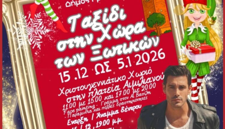 Η επίσημη έναρξη των χριστουγεννιάτικων εκδηλώσεων «ΤΑΞΙΔΙ ΣΤΗΝ ΧΩΡΑ ΤΩΝ ΞΩΤΙΚΩΝ» θα πραγματοποιηθεί την Δευτέρα 15 Δεκεμβρίου και ώρα 19:00 το απόγευμα στην Πλατεία Αιμιλιανού, με τη φωταγώγηση του Χριστουγεννιάτικου Δέντρου, ενώ θα ακολουθήσει συναυλία με τον Κώστα Μαρτάκη!