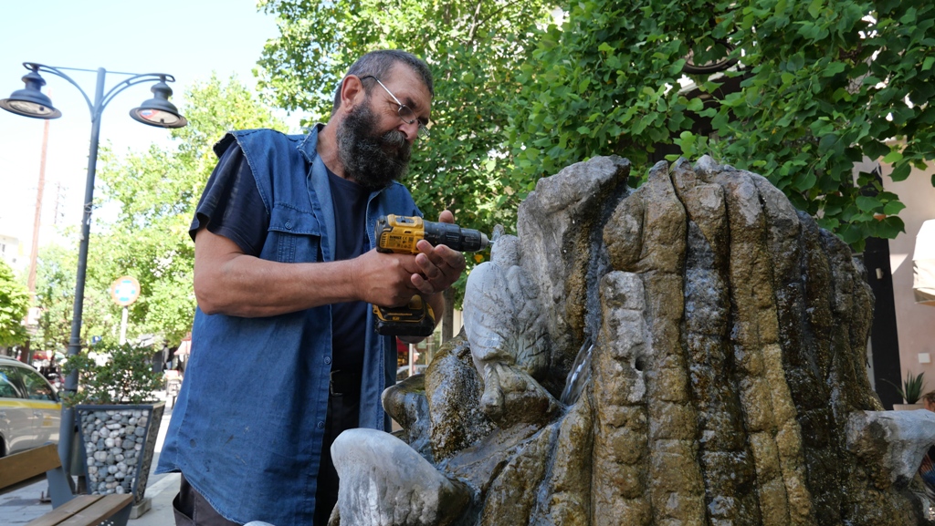Αγέρωχα βουνά, κρυστάλλινα ποτάμια, δέντρα μεγαλόπρεπα, χιλιάδες μανιτάρια και το χαρακτηριστικό πάτημα της αρκούδας, είναι συμβολισμοί και μοτίβα που συνθέτουν αρμονικά το μοναδικό πέτρινο σιντριβάνι του Δήμου Γρεβενών, το οποίο από το 2017 κοσμεί την μικρή πλατεία, μπροστά από το Δημαρχείο.