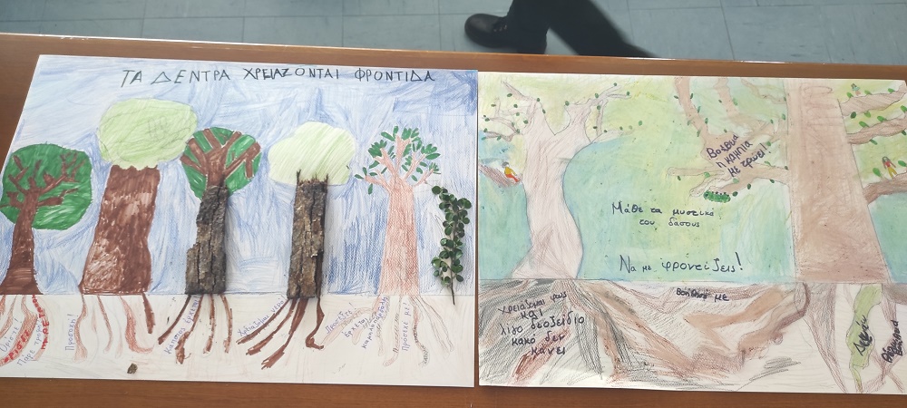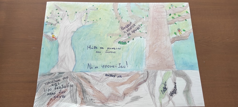 Τα παιδιά εμπνευσμένα από ό,τι είδαν, άκουσαν και διάβασαν χωρίστηκαν σε τρεις ομάδες και πάνω σε χαρτόνι αποτύπωσαν την εικόνα του δάσους με τις εξωτερικές ομορφιές αλλά και το ζωντανό υπόγειο δίκτυο τους. Ζωγράφισαν τρεις υπέροχους πίνακες με δυνατά οικολογικά μηνύματα ελπίζοντας να εισακουστούν σε όλο τον κόσμο.
