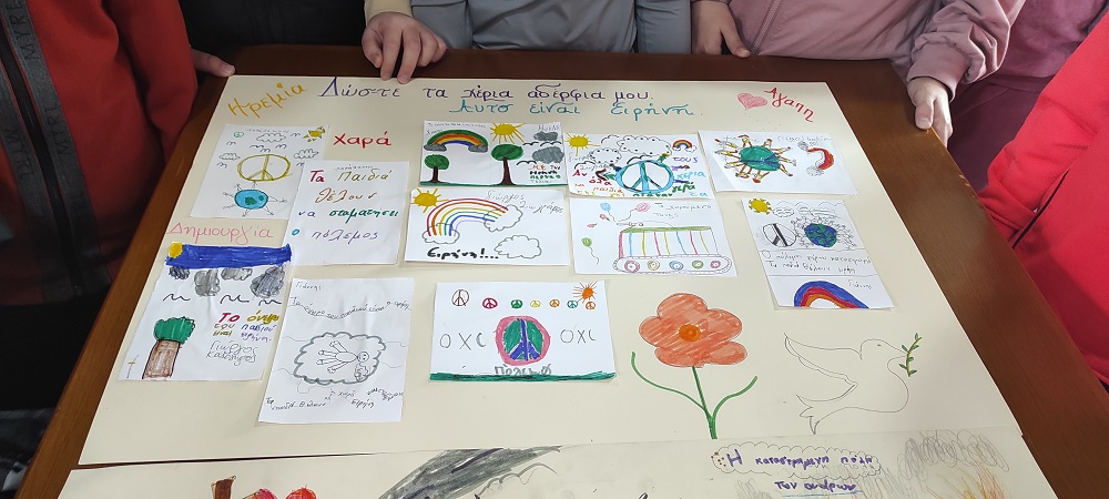 Μετά την ανάγνωση του βιβλίου μας χωρίστηκαν τα παιδιά σε τρεις ομάδες και ανέλαβαν… δράση, για να τιμήσουν την πολυπόθητη Ειρήνη! Η μια ομάδα φιλοτέχνησε με έντονα, χαρούμενα χρώματα μια πόλη ειρηνική, όπου όλοι ζουν αρμονικά και δημιουργικά και της έδωσε το όνομα Ειρήνη. Μέσα στην μεγάλων διαστάσεων ζωγραφιά τους έγραψαν λέξεις συνώνυμες της ειρήνης, όπως γαλήνη, χαρά, ευτυχία. Η αποστολή της δεύτερης ομάδας ήταν να παρουσιάσει μια πόλη που βιώνει το δράμα της πολεμικής σύρραξης. Με ζοφερά χρώματα απεικόνισαν την «Καταστρεμμένη πόλη των ονείρων», όπως την ονόμασαν. Σε αυτή δέσποζαν φλεγόμενα κτίρια, τανκς είχαν κατακλύσει τους δρόμους, η καταστροφή κυριαρχούσε. Έργο της τρίτης ομάδας ήταν η δημιουργία αντιπολεμικών μηνυμάτων. « Όχι στον πόλεμο», « Τα παιδιά ονειρεύονται την ειρήνη», « Η ειρήνη είναι αυτό που θέλουμε!», είναι μερικά από τα μηνύματα τους. Ο τίτλος που έδωσαν στο έργο τους ήταν «Δώστε τα χέρια αδέρφια μου. Αυτό είναι ειρήνη» εμπνευσμένος από το έργο του σπουδαίου μας ποιητή Γιάννη Ρίτσου, « Ειρήνη».