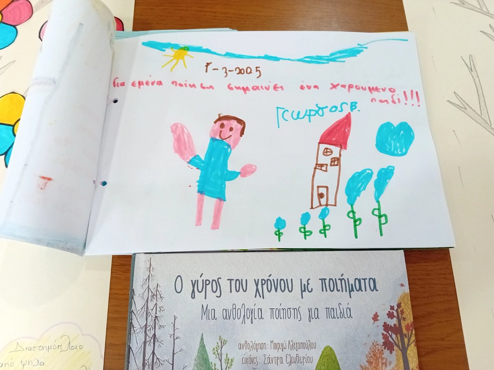 Επηρεασμένα από την ομορφιά της δράσης σε μια κόλα χαρτί έδωσαν μορφή στην ποίηση και γράψαμε τι σημαίνει η ποίηση. Οι ζωγραφιές καταπληκτικές και τα μηνύματα συγκινητικά. Ποίηση σημαίνει ένα παιδί χαμογελαστό, ποίηση σημαίνει λουλούδια ανθισμένα, ποίηση σημαίνει το σπίτι μου και τόσα άλλα που τα δέσαμε και φτιάξαμε ένα βιβλιαράκι γεμάτο συναίσθημα που θα τους θυμίζει τη ξεχωριστή αυτή ημέρα.