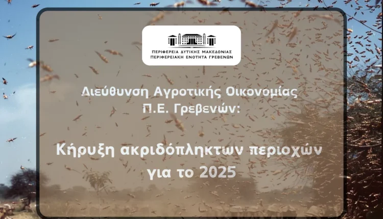 Σύμφωνα με την υπ’ αριθμ 58429/09-4-2024 απόφαση του Περιφερειάρχη Δυτικής Μακεδονίας κηρύσσονται ακριδόπληκτες οι κάτωθι περιοχές της Περιφερειακής Ενότητας Γρεβενών για το 2025.