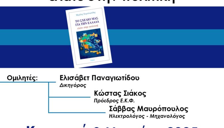 Θέμα της εκδήλωσης είναι: «ΤΟ ΣΧΕΔΙΟ ΜΑΣ ΓΙΑ ΤΗΝ ΕΛΛΑΔΑ – ελάτε στην Πολιτική»