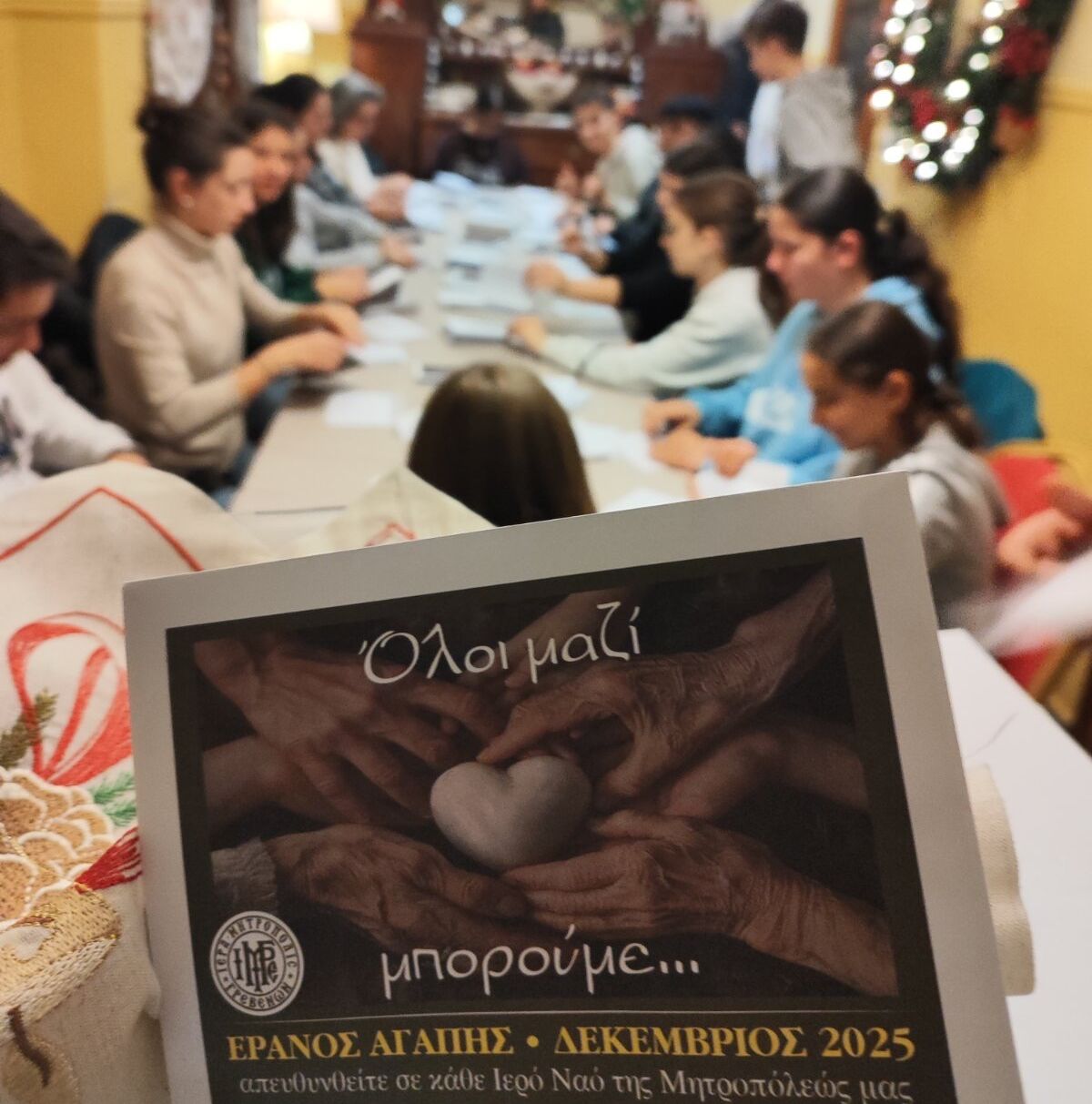 Την Παρασκευή 12 Δεκεμβρίου 2025, το απόγευμα, οι εφηβικές ομάδες αγοριών και κοριτσιών της Ιεράς μας Μητροπόλεως ανταποκρίθηκαν με προθυμία στο κάλεσμα αγάπης και προσφοράς, συμμετέχοντας στην προετοιμασία του Εράνου Αγάπης.