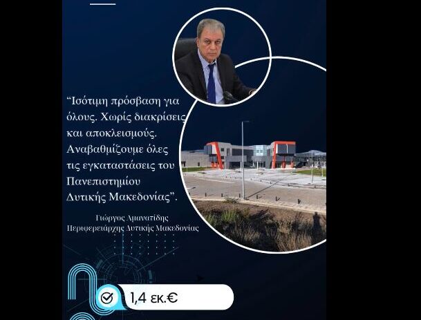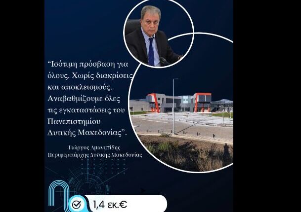 Πρόκειται για το έργο με τίτλο «Βελτίωση προσβασιμότητας και της ισότιμης πρόσβασης στην εκπαίδευση φοιτητών με αναπηρίες και ειδικές εκπαιδευτικές ανάγκες στο Πανεπιστήμιο Δυτικής Μακεδονίας», συνολικού προϋπολογισμού 1,4 εκατομμυρίων ευρώ, με δικαιούχο το ίδιο το Πανεπιστήμιο.