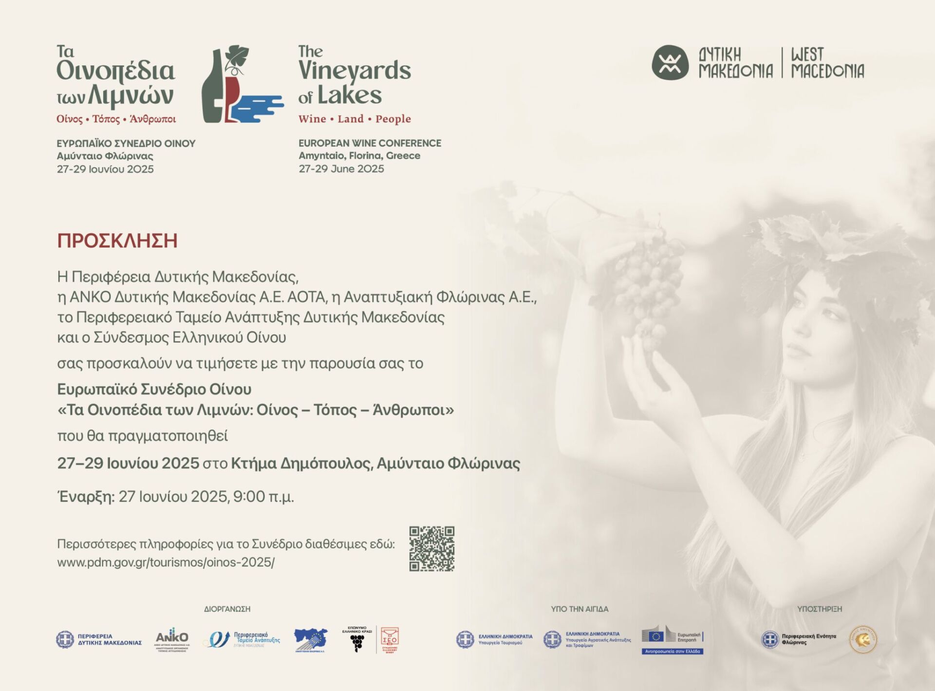Η Περιφέρεια Δυτικής Μακεδονίας, η ΑΝΚΟ Δυτικής Μακεδονίας Α.Ε. – Αναπτυξιακός Οργανισμός Τοπικής Αυτοδιοίκησης, η Αναπτυξιακή Φλώρινας Α.Ε., το Περιφερειακό Ταμείο Ανάπτυξης Δυτικής Μακεδονίας και ο Σύνδεσμος Ελληνικού Οίνου σας προσκαλούν να παρακολουθήσετε το Ευρωπαϊκό Συνέδριο Οίνου με τίτλο: «Τα Οινοπέδια των Λιμνών: Οίνος – Τόπος – Άνθρωποι».
