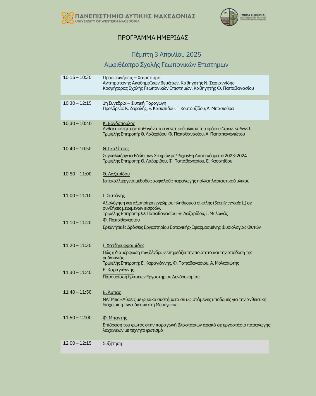 Κατά τη διάρκεια της ημερίδας, μέλη ΔΕΠ και υποψήφιοι διδάκτορες του Τμήματος θα παρουσιάσουν το ερευνητικό τους έργο, μέσα από τρεις θεματικές συνεδρίες: Φυτική Παραγωγή, Ζωική Παραγωγή και Αγροτική Οικονομία.