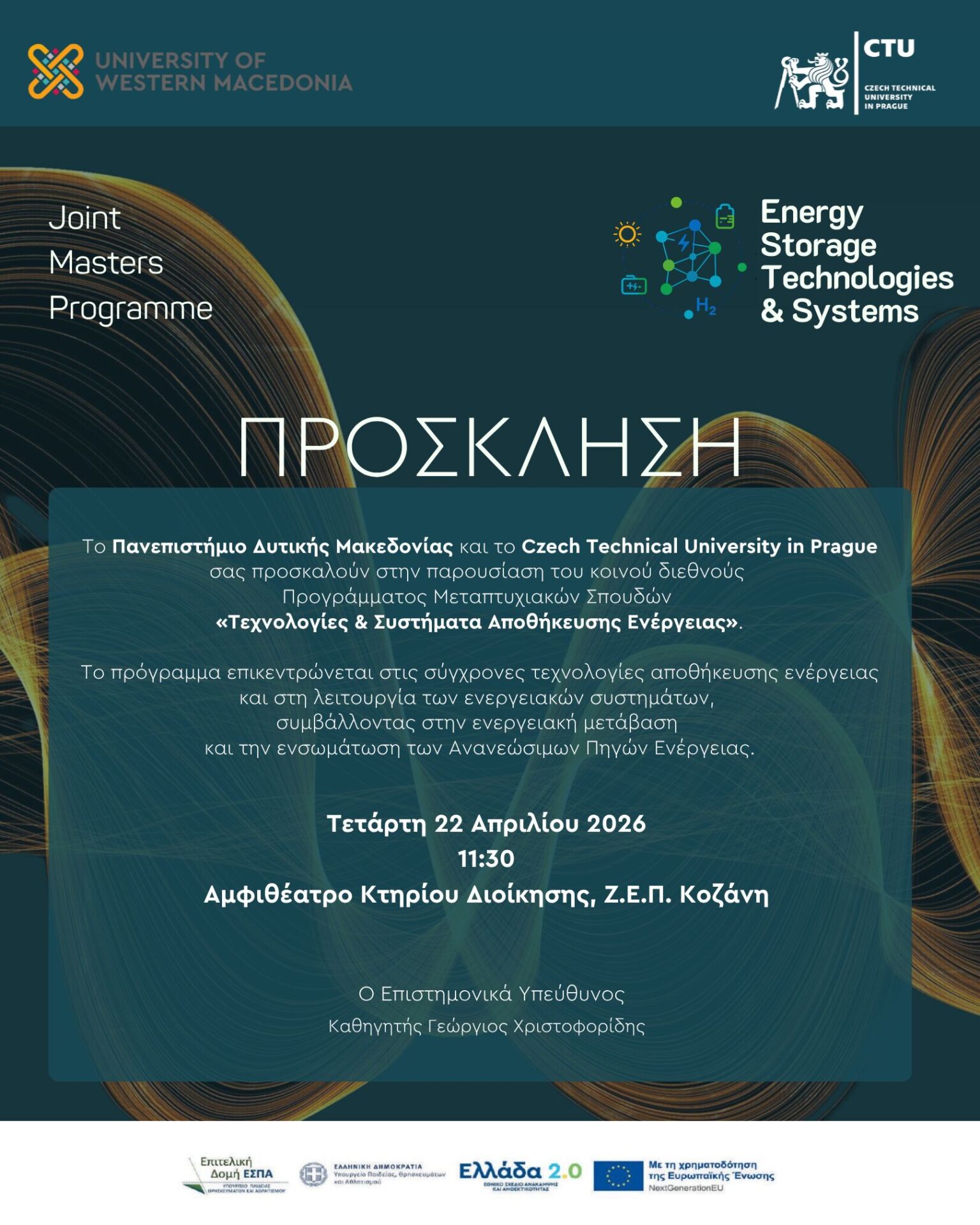 Παρουσιάζεται την Τετάρτη 22 Απριλίου 2026, στις 11:30, στο Αμφιθέατρο του Κτιρίου Διοίκησης στη ΖΕΠ Κοζάνης, το νέο Κοινό Διεθνές Πρόγραμμα Μεταπτυχιακών Σπουδών «Τεχνολογίες και Συστήματα Αποθήκευσης Ενέργειας», που υλοποιείται από το Πανεπιστήμιο Δυτικής Μακεδονίας σε συνεργασία με το Czech Technical University in Prague (CTU).