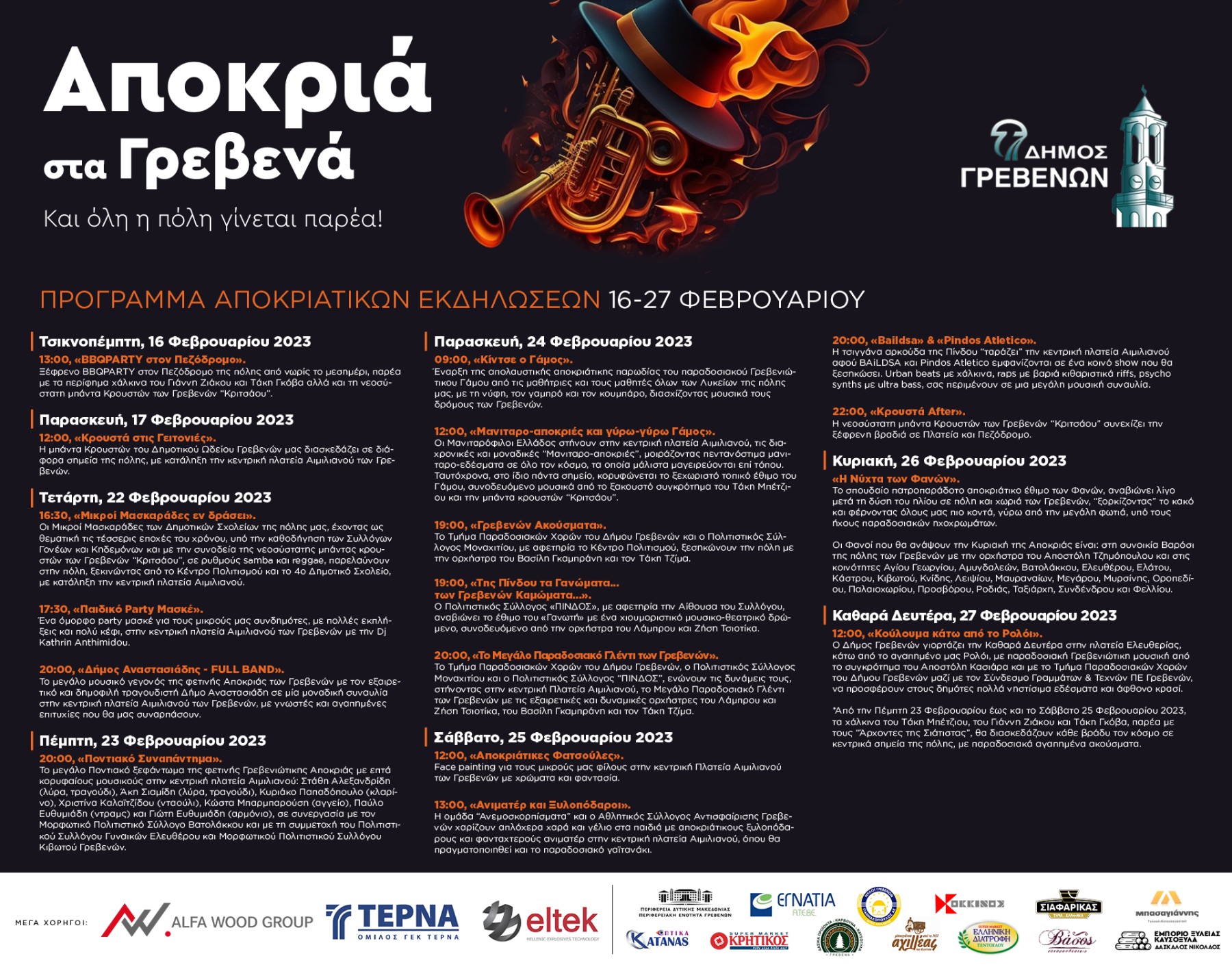 Το αναλυτικό πρόγραμμα των αποκριάτικων εκδηλώσεων του Δήμου Γρεβενών από τις 16 έως τις 27 Φεβρουαρίου 2023: