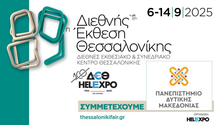 Το Πανεπιστήμιο Δυτικής Μακεδονίας συμμετέχει για τέταρτη συνεχόμενη χρονιά στη 89η Διεθνή ‘Εκθεση Θεσσαλονίκης (ΔΕΘ), που θα πραγματοποιηθεί από 6 έως 14 Σεπτεμβρίου 2025, συνεχίζοντας τις πρωτοβουλίες δυναμικής εξωστρέφειας και δικτύωσης.