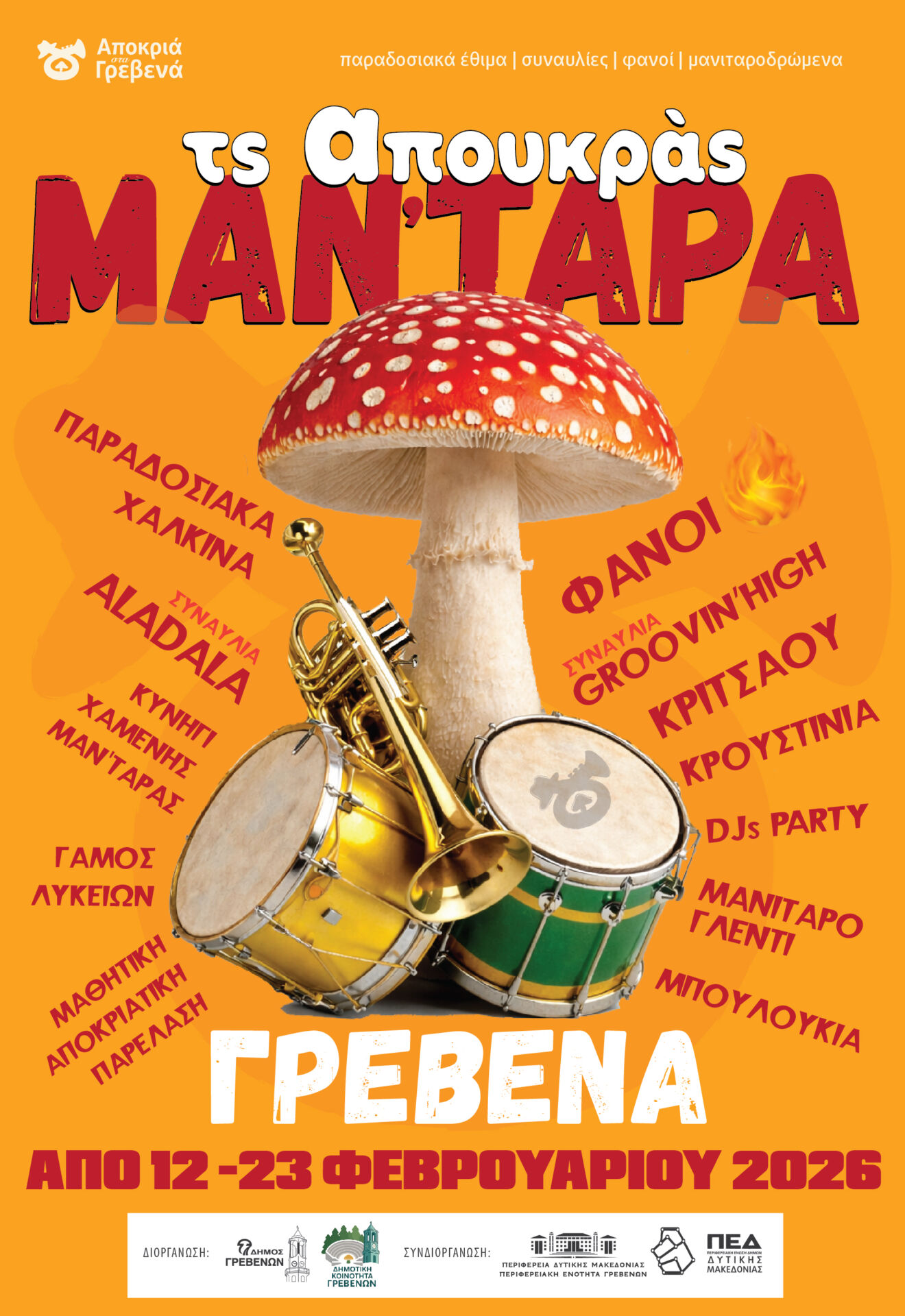 Στα Γρεβενά των μανιταριών και των γεύσεων, των χάλκινων και των κρουστών, της παράδοσης που αντηχεί στις πλατείες και στα σοκάκια και του κεφιού που ενώνει μικρούς και μεγάλους, ξεδιπλώνεται και φέτος το Γρεβενιώτικο Καρναβάλι «ΤΣ΄ ΑΠΟΥΚΡΑΣ ΜΑΝ’ΤΑΡΑ»!!!