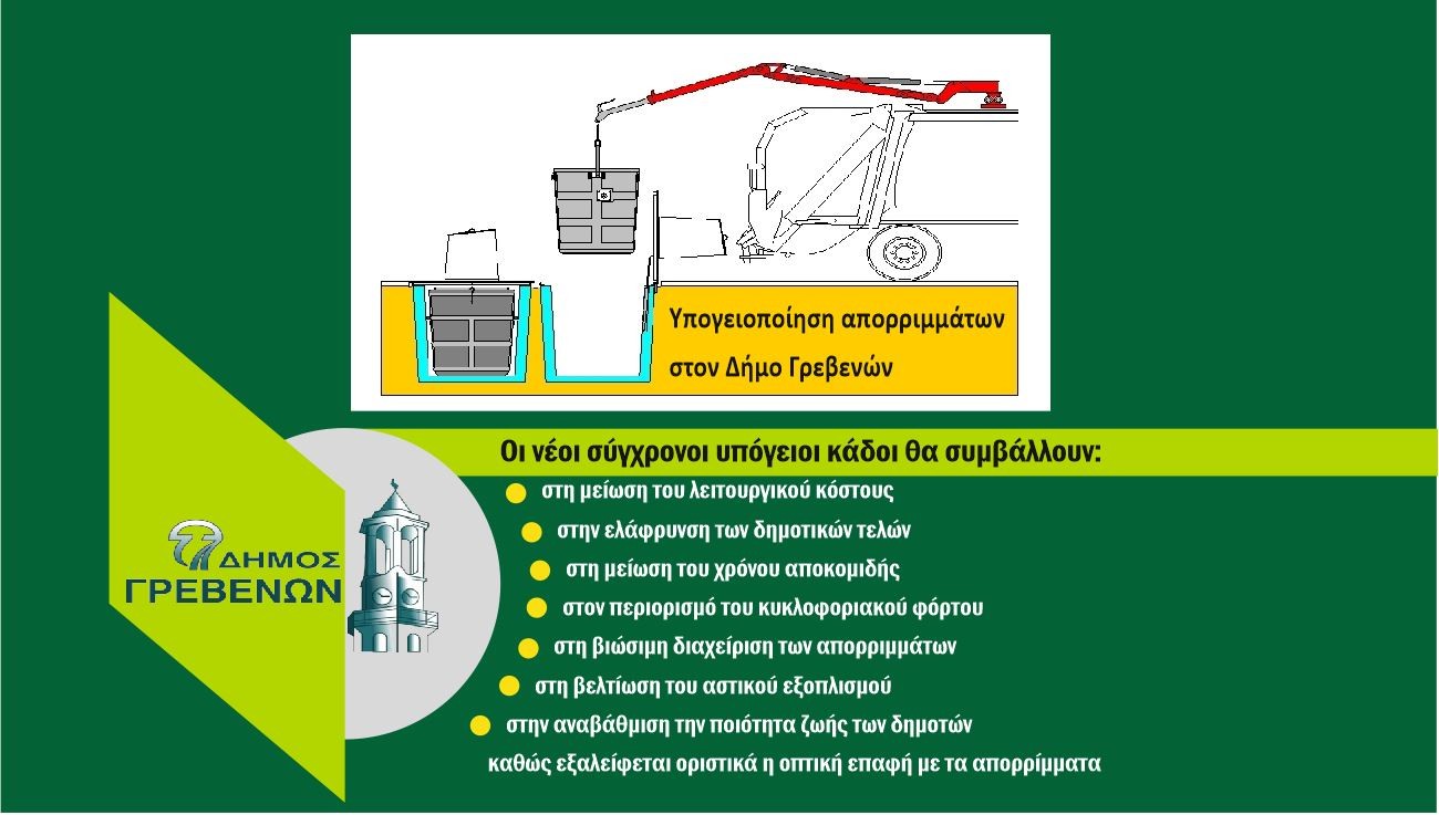 «Ο Δήμος Γρεβενών, μέσω της υπογειοποίησης της αποθήκευσης των απορριμμάτων, προσδοκά να πετύχει μια αναβάθμιση της καθημερινότητας δημοτών και επισκεπτών, καλύτερη αρχιτεκτονική εναρμόνιση του περιβάλλοντα χώρου στα σημεία εγκατάστασης, αλλά και καλύτερες επιδόσεις στον τομέα της αποκομιδής», τονίζει από την πλευρά του ο αρμόδιος Αντιδήμαρχος Περιβάλλοντος & Ανακύκλωσης Ζήσης Κιάκας και καταλήγει:«Αυτό συνεπάγεται απουσία υπολειμμάτων, εξάλειψη δυσωδιών και μείωση του λειτουργικού κόστους για τον Δήμο αφού δεν θα χρειάζεται πλέον αποκομιδή σε καθημερινή βάση».