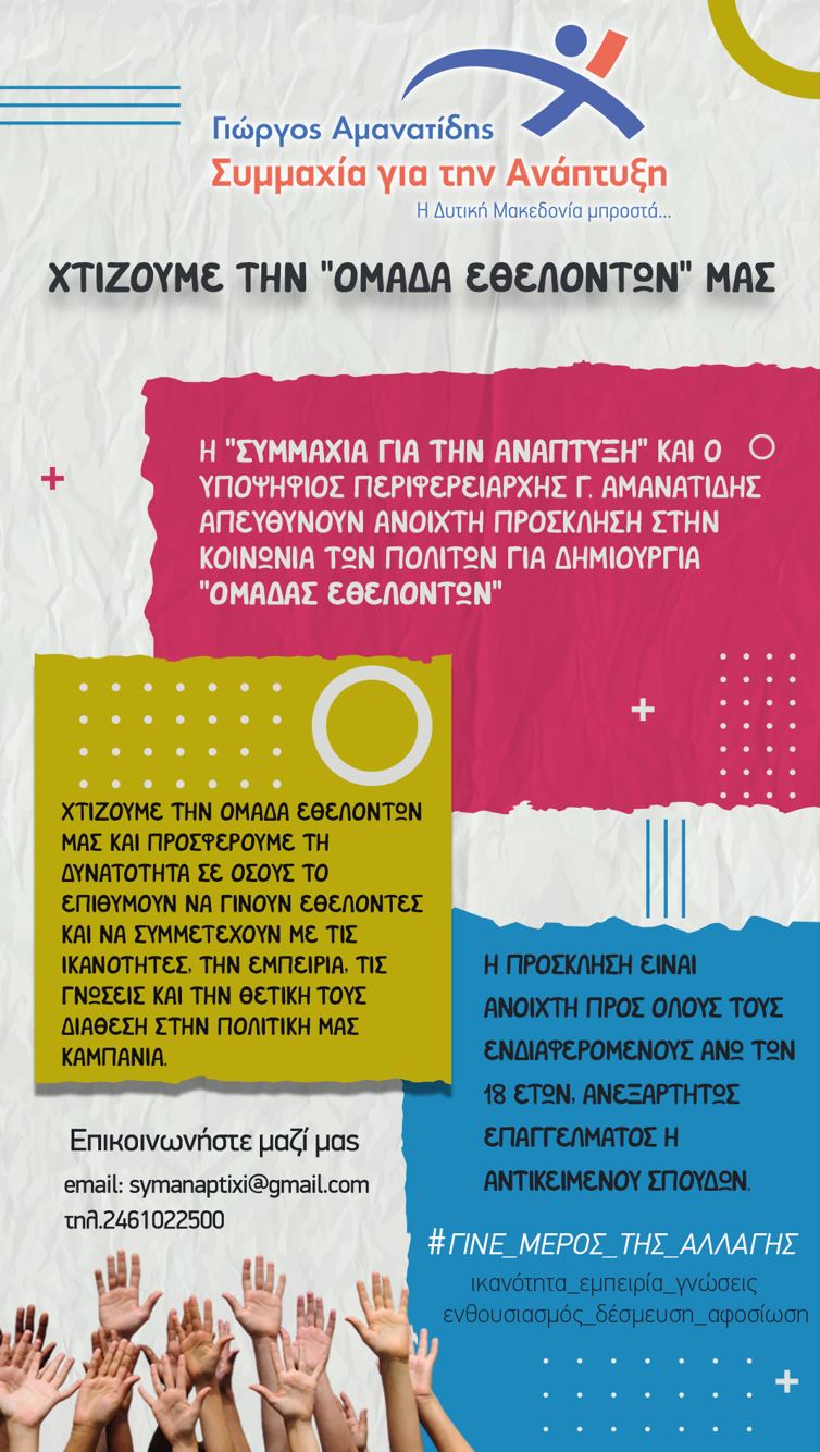Η «Συμμαχία για την Ανάπτυξη» και ο υποψήφιος Περιφερειάρχης Δυτικής Μακεδονίας Γιώργος Αμανατίδης απευθύνουν ανοιχτή πρόσκληση στην Κοινωνία των Πολιτών για τη δημιουργία «Ομάδας Εθελοντών».