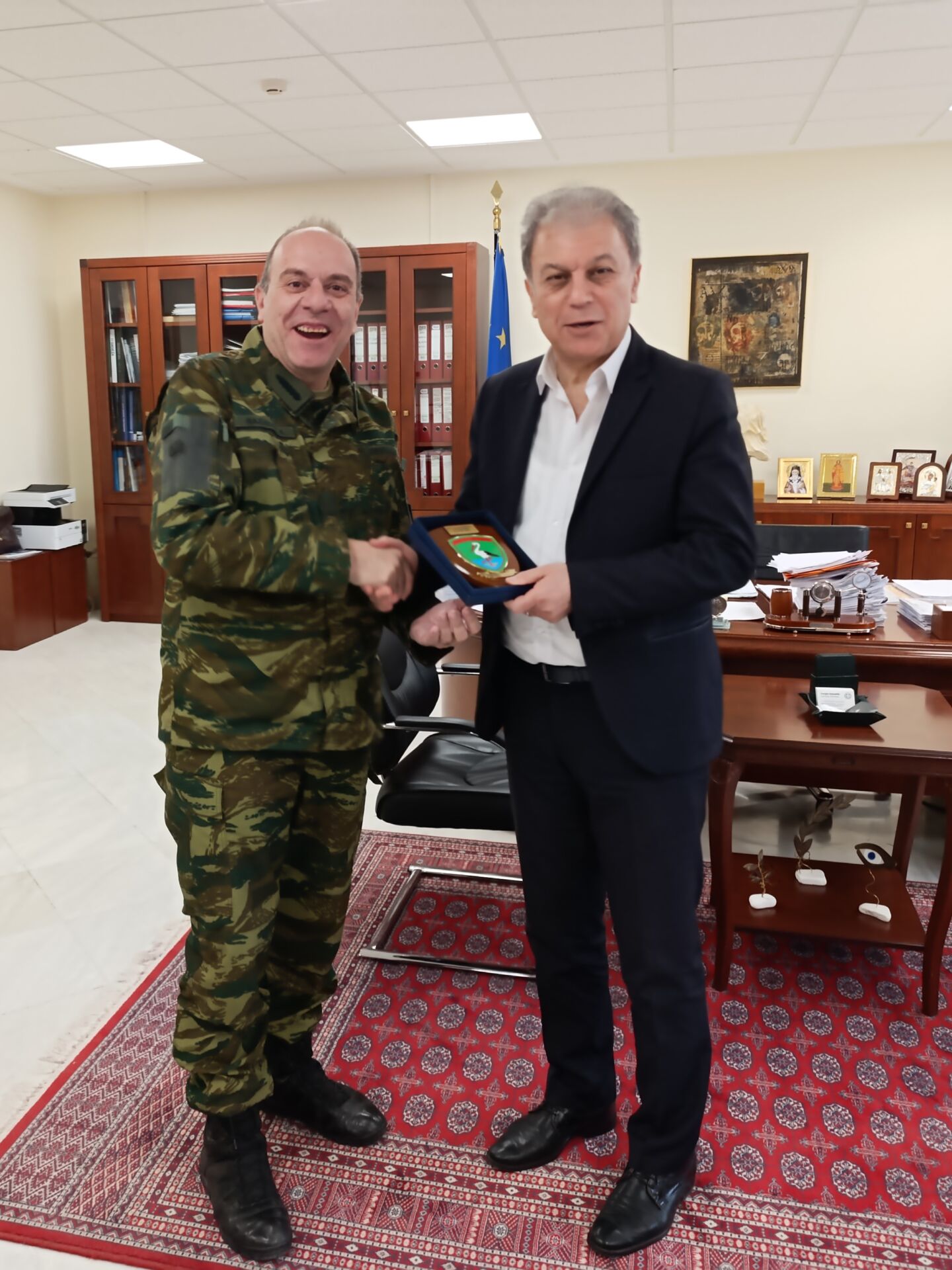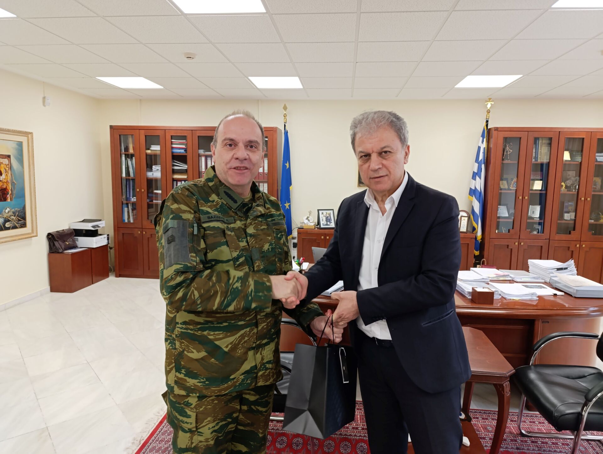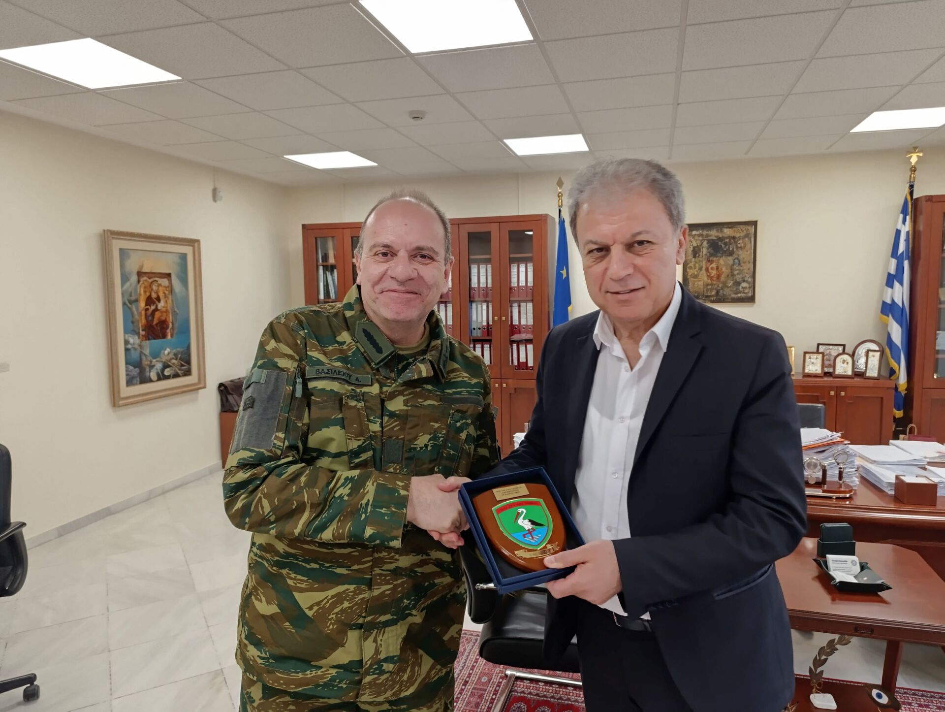 Κατά τη διάρκεια της εθιμοτυπικής συνάντησης ο Περιφερειάρχης ευχήθηκε στον Ταξίαρχο καλή επιτυχία στα νέα καθήκοντα που έχει αναλάβει, αναφέρθηκε στην πολύ καλή συνεργασία που υπάρχει μεταξύ περιφέρειας και στρατού, ενώ εξήρε τον σημαντικό ρόλο και την καθοριστική συνδρομή των ενόπλων δυνάμεων στην ασφάλεια της πατρίδας μας.