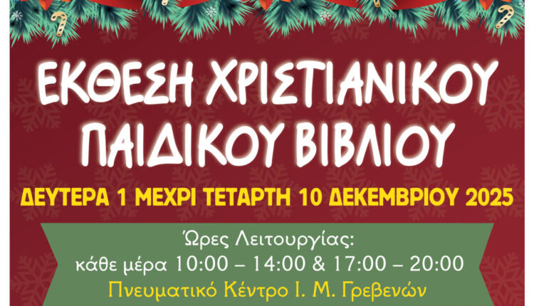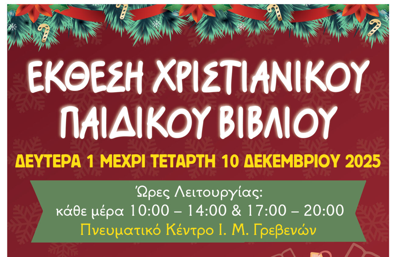 Tο Βιβλιοπωλείο “Αναλόγιον” της Ιεράς Μητροπόλεως Γρεβενών, όπως κάθε χρόνο έτσι και φέτος, διοργανώνει Έκθεση Παιδικού Χριστιανικού Βιβλίουστο Πνευματικό Κέντρο της Ιεράς Μητροπόλεως, από 1 μέχρι 10 Δεκεμβρίου2025, με ώρες λειτουργίας πρωί 10:00 με 14:00 και απόγευμα 17:00 με 20:00.