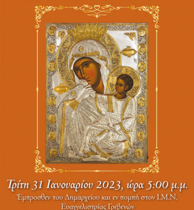 Η επίσημος υποδοχή θα λάβει χώρα την Τρίτη 31 Ιανουαρίου και ώρα 5.00 μ.μ. στον κόμβο έμπροσθεν Δημαρχείου των Γρεβενών και εν πομπή θα λιτανευτεί έως τον Ιερό Μητροπολιτικό Ναό Ευαγγελιστρίας, όπου θα ακολουθήσει Δοξολογία και Αρχιερατικός Εσπερινός μετ’ αρτοκλασίας, χοροστατούντος του Σεβασμιωτάτου Μητροπολίτου μας κ. Δαβίδ.