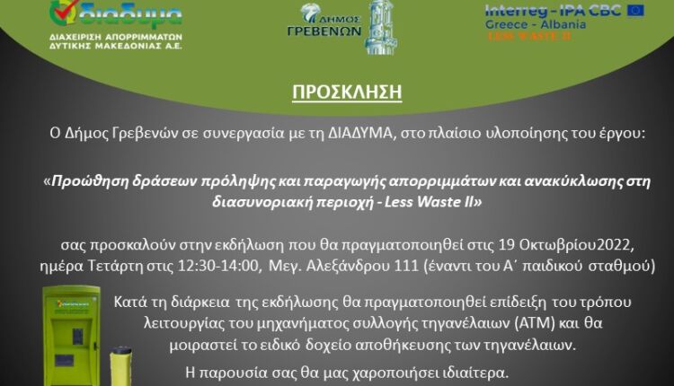Ο Δήμος Γρεβενών και η ΔΙΑΔΥΜΑ Α.Ε. στο πλαίσιο υλοποίησης του έργου: «Προώθηση δράσεων πρόληψης και παραγωγής απορριμμάτων και ανακύκλωσης στη διασυνοριακή περιοχή – Less Waste II» προωθούν ένα νέο, καινοτόμο, σύστημα χωριστής συλλογής τηγανελαίων από νοικοκυριά.
