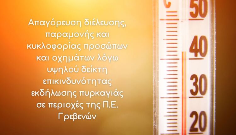 Με την με αρ. πρωτ. οικ. 95659/ 12-06-2024 Απόφαση Περιφερειάρχη Δυτικής Μακεδονίαςαποφασίστηκε η απαγόρευση διέλευσης, παραμονής και κυκλοφορίας προσώπων και οχημάτων για αύριο Πέμπτη 24 Ιουλίου 2025 λόγω αυξημένου δείκτη επικινδυνότητας εκδήλωσης πυρκαγιάς (δείκτης 3), στις παρακάτω περιοχές της Περιφερειακής Ενότητας Γρεβενών από τις 10:00 έως 22:00 ως εξής: