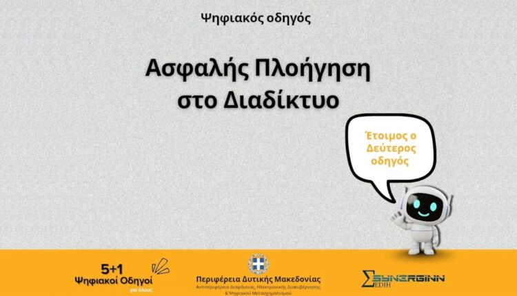 Μετά και την ιδιαίτερα θετική ανταπόκριση που είχε ο πρώτος οδηγός της σειράς με θέμα τις Χρήσιμες Συμβουλές για το gov.gr, η Περιφέρεια Δυτικής Μακεδονίας παρουσιάζει τον δεύτερο οδηγό της σειράς «5+1 Ψηφιακοί Οδηγοί για Όλους» με τίτλο «Ασφαλής Πλοήγηση στο Διαδίκτυο».