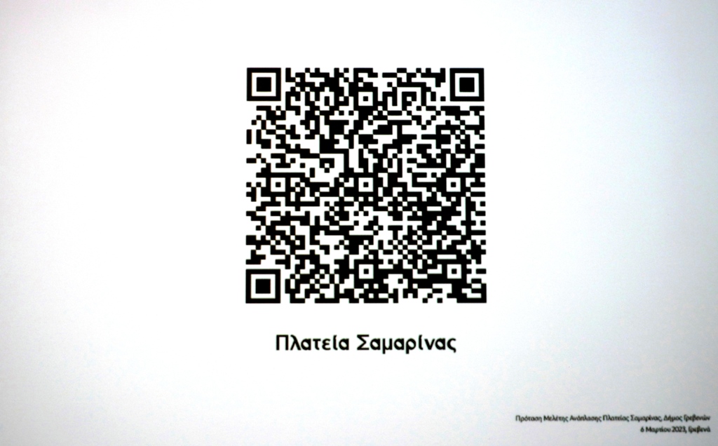 Κλείνοντας, όσοι επιθυμούν, μπορούν μέσω QR code να κατεβάσουν στο κινητό τους τηλέφωνο την πρώτη ψηφιακή απεικόνιση της νέας πλατείας Σαμαρίνας σε θέα 360 μοιρών (ή κάνοντας κλικ εδώ) αλλά και να αποστείλουν τυχόν προτάσεις, απόψεις και παρατηρήσεις επί του έργου στο dtydimoygrevenon@gmail.com, προκειμένου να ληφθούν υπόψη στις επόμενες φάσεις του σχεδιασμού.