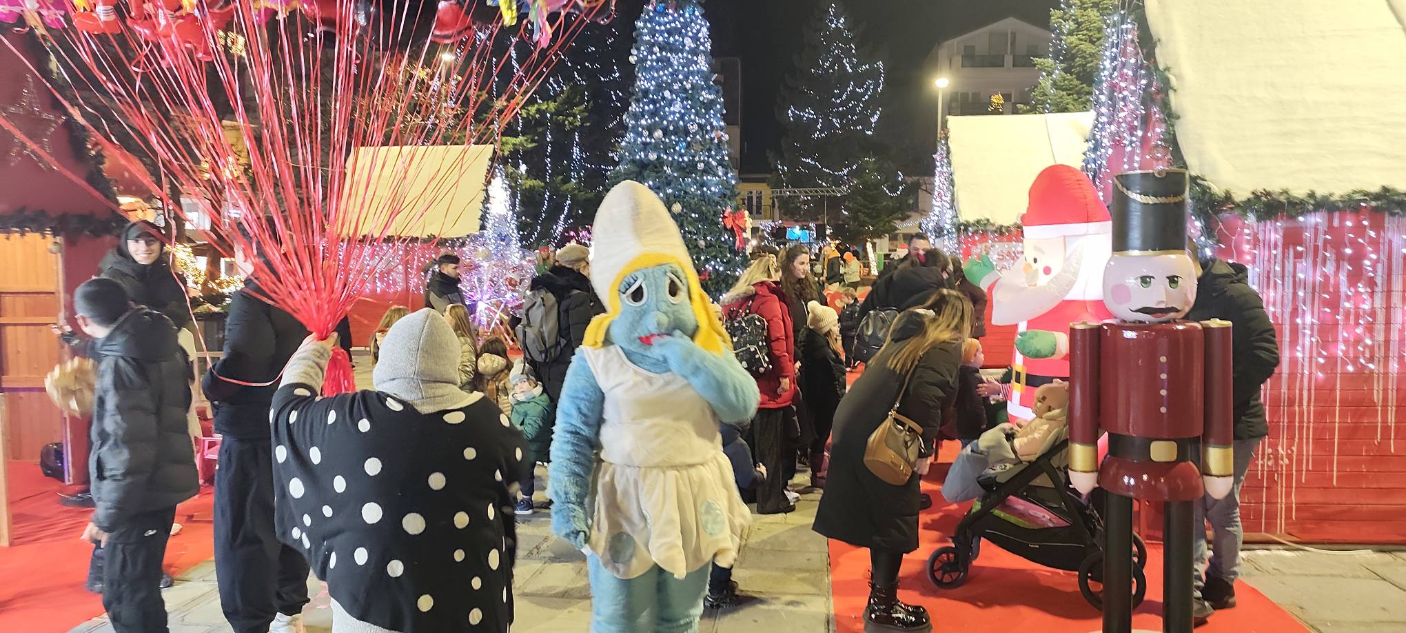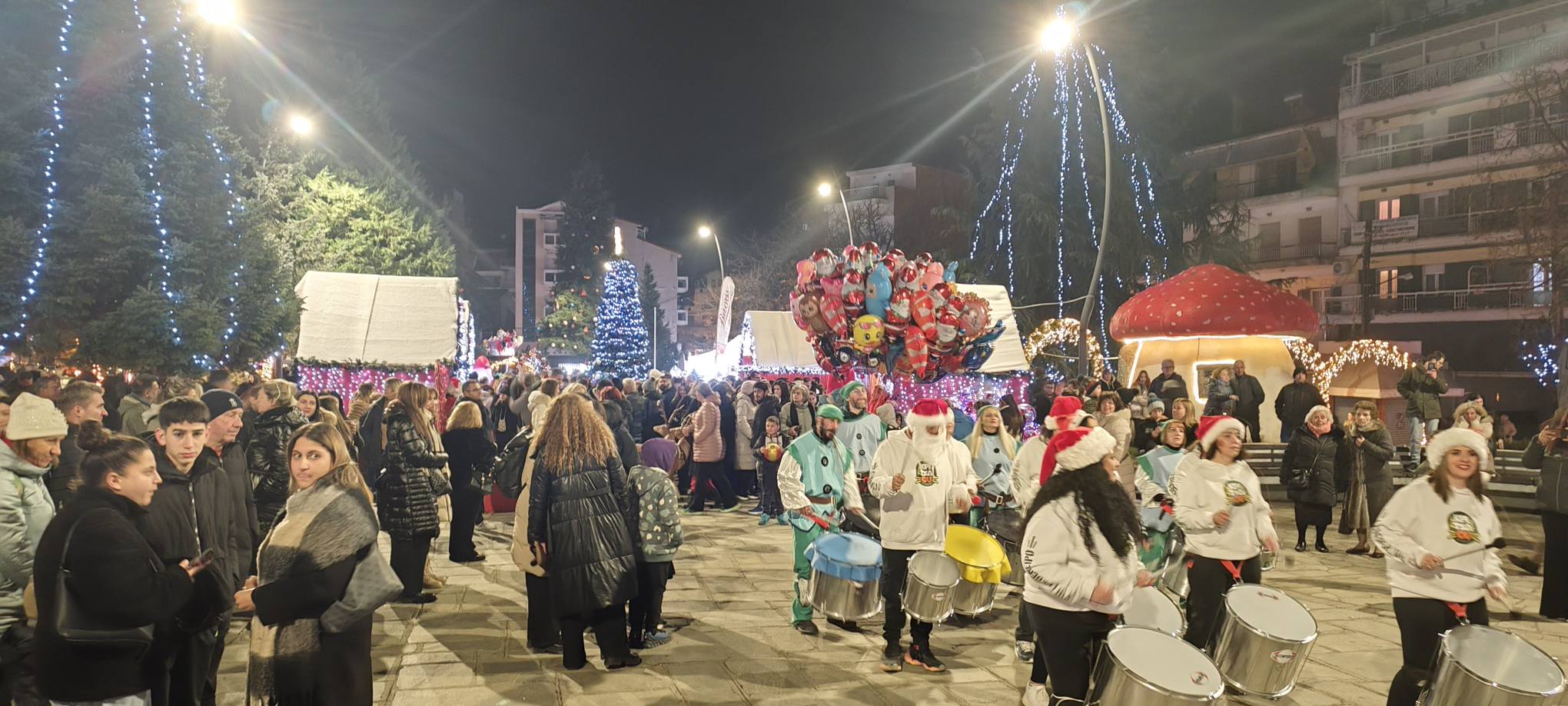Παράλληλα, η πλατεία είχε μετατραπεί σε γιορτινό χώρο για μικρούς και μεγάλους, με ξύλινα σπιτάκια, face painting και ζωγραφική για τα παιδιά, καθώς και την παρουσία του Άγιου Βασίλη, που μοίραζε χαμόγελα και ενίσχυε τη μαγική χριστουγεννιάτικη ατμόσφαιρα.