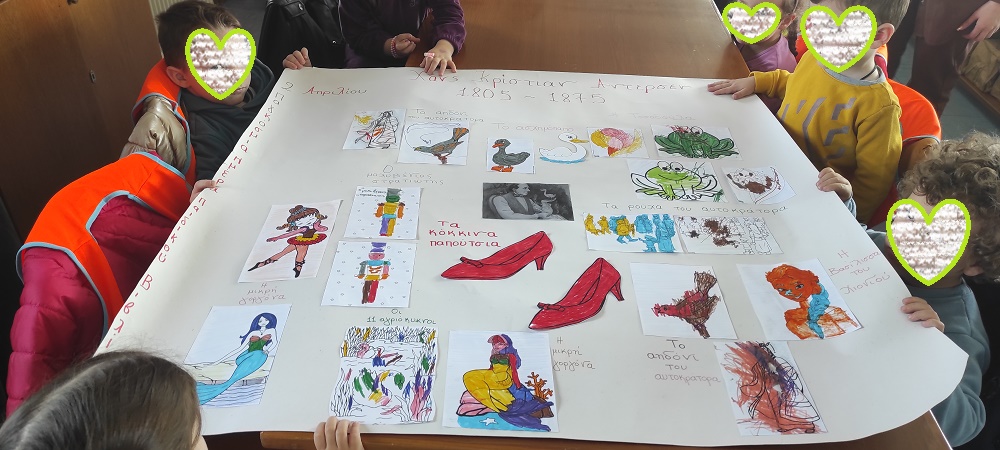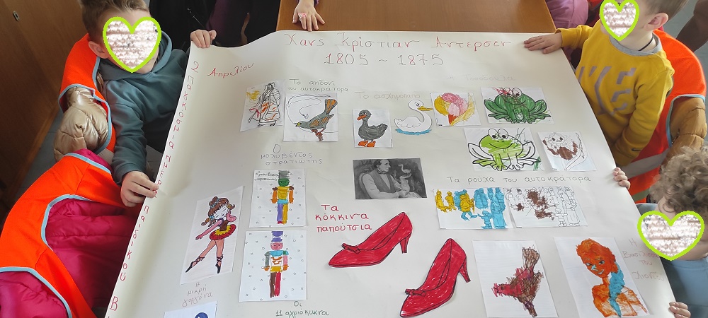 Μετά την ανάγνωση του παραμυθιού « Η πριγκίπισσα και το μπιζέλι» ανέλαβαν… δράση, για να ζωντανέψουν τους ήρωες των παραμυθιών του Άντερσεν! Τους χρωμάτισαν με όμορφα φωτεινά χρώματα και δημιούργησαν ένα κολλάζ αποτυπώνοντας έτσι το… παραμυθένιο σύμπαν αυτού του δημιουργού. Σε αυτό το έργο τους η Τοσοδούλα κάνει παρέα με την Μικρή Γοργόνα, το αηδόνι κελαηδάει στον Αυτοκράτορα, τα Κόκκινα παπούτσια είναι έτοιμα για χορό, το Ασχημόπαπο μεταμορφώνεται σε κύκνο, ο Μολυβένιος στρατιώτης και η Μπαλαρίνα του χαίρονται που είναι μαζί, οι Έντεκα αγριόκυκνοι απολαμβάνουν μια βόλτα στη λίμνη και ο ματαιόδοξος Αυτοκράτορας ψάχνει τα ρούχα του.