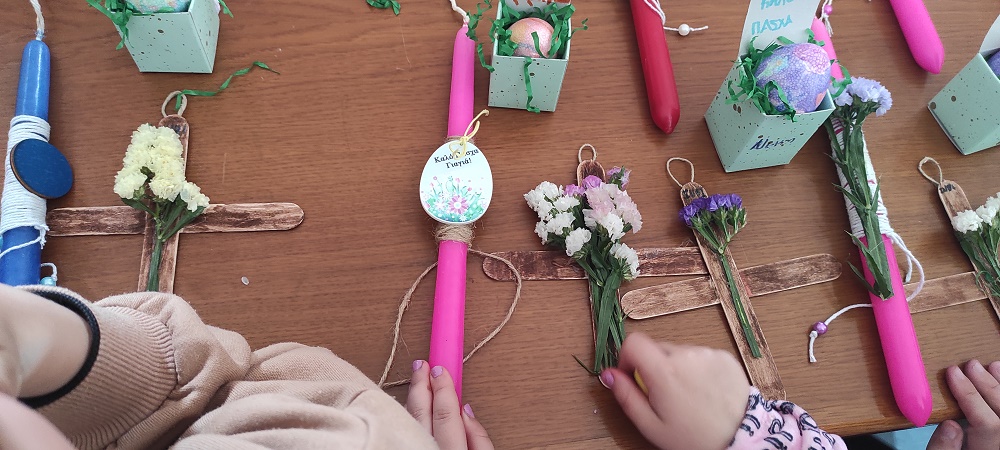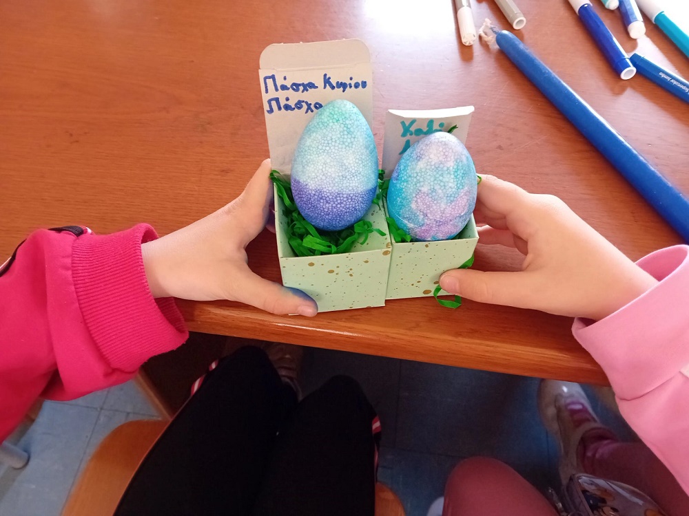 Αρχικά κλήθηκαν να διακοσμήσουν το δικό τους πασχαλινό αυγό το οποίο τοποθετήθηκε σε όμορφο κουτάκι με χρυσές λεπτομέρειες, η καλλιτεχνική τους όμως διάθεση δεν περιορίστηκε μόνο σε αυτή τη δραστηριότητα. Δεύτερη αποστολή που τους ανατέθηκε ήταν η διακόσμηση μίας πασχαλινής λαμπάδας, ακόμη ενός πασχαλινού συμβόλου που αναπαριστά το Φως που έφερε στην ανθρωπότητα ο Χριστός. Το Φως της ελπίδας και της αγάπης. Η επόμενη δραστηριότητα με την οποία έκλεισε το πασχαλινό μας εργαστήρι ήταν η δημιουργία ενός ξύλινου σταυρού, το σύμβολο της Θυσίας του Θεανθρώπου και συνάμα της Αιώνιας ζωής. Στο τρίπτυχο των δράσεων ανταποκρίθηκαν με ενθουσιασμό, χαρά, μεράκι.