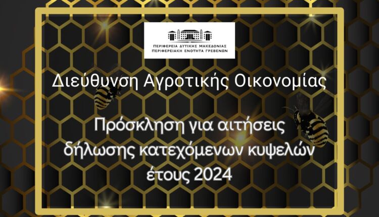 Από τη Διεύθυνση Αγροτικής Οικονομίας της Π.Ε. Γρεβενών, ανακοινώνεται ότι σε εφαρμογή της υπ΄αρίθμ.140/106513 (ΦΕΚ1560/Β΄/17-04-2021)Υπουργικής Απόφασης και όπως έχει τροποποιηθεί και ισχύει, έχει ξεκινήσει η υποβολή της ΔΗΛΩΣΗΣ ΚΑΤΕΧΟΜΕΝΩΝ ΚΥΨΕΛΩΝ και καλεί όλους τους ενεργούς μελισσοκόμους να υποβάλλουν την ετήσια και υποχρεωτική Δήλωση Έτους 2024 από: 01 Σεπτεμβρίου2024 έως και 20 Νοεμβρίου 2024.