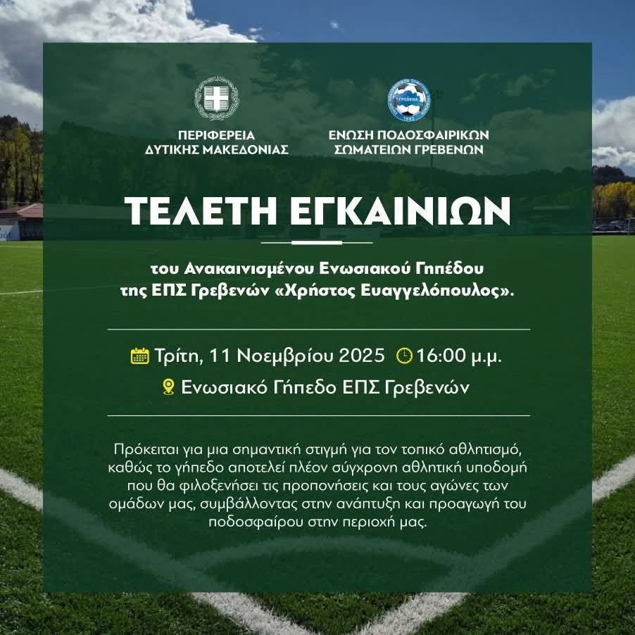 Η Ένωση Ποδοσφαιρικών Σωματείων Γρεβενών με χαρά ανακοινώνει τα εγκαίνια του ανακαινισμένου Ενωσιακού της Γηπέδου, που θα πραγματοποιηθούν την Τρίτη 11 Νοεμβρίου 2025, στις 16:00, στο Ενωσιακό Γήπεδο ΕΠΣ Γρεβενών.