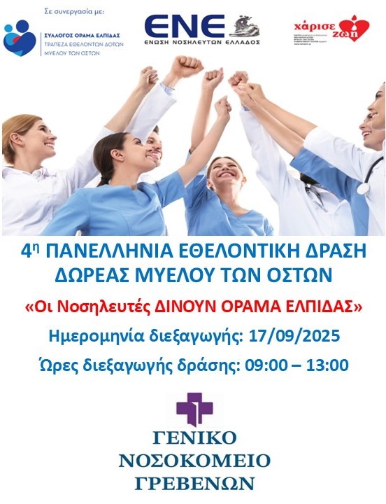 Η Διοίκηση και η Διεύθυνση της Νοσηλευτικής Υπηρεσίας του Γ.Ν. Γρεβενών σε συνεργασία με την Ένωση Νοσηλευτών Ελλάδος και το σύλλογο «ΟΡΑΜΑ ΕΛΠΙΔΑΣ», στο πλαίσιο της Παγκόσμιας Ημέρας Εθελοντή Δότη Μυελού των Οστών 2025, προσκαλεί τους Νοσηλευτές, τους επαγγελματίες υγείας, καθώς και όλους τους πολίτες που επιθυμούν και πληρούν τα κριτήρια, να συμμετάσχουν στην 4η Πανελλαδική Εθελοντική Δράση Δωρεάς Μυελού Οστών: