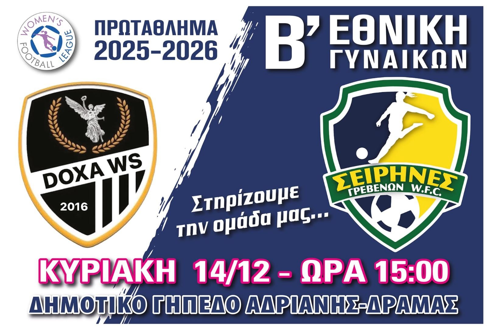 Η γυναικεία ομάδα ποδοσφαίρου των Σειρήνων Γρεβενών ετοιμάζεται για την εκτός έδρας αναμέτρηση με τη Δόξα Δράμας, που θα διεξαχθεί την Κυριακή 14 Δεκεμβρίου στο γήπεδο της Αδριανής.