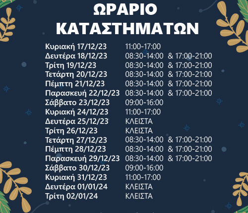 Παρασκευή 22/12/23: 08:30-14:00 ΚΑΙ 17:00-21:00