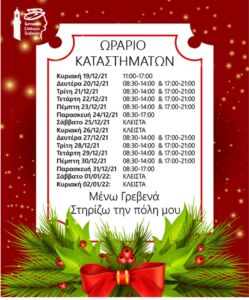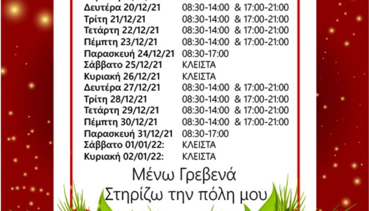 Εμπορικός Σύλλογος Γρεβενών: Το εορταστικό ωράριο λειτουργίας Γρεβενά Από igrevena Τελευταία ενημέρωση Dec 18, 2021 Κοινοποίηση Παρόμοια Άρθρα Μικροκλεισούρα – Το χωριό που δείχνει τον δρόμο της… Nov 4, 2025 ΑΔΕΔΥ/ Νομαρχιακό Τμήμα Γρεβενών: Ψήφισμα σωματείων,… Nov 4, 2025 Αποφάσεις Διοικητικού Συμβουλίου Πολιτιστικού Συλλόγου… Nov 4, 2025 Ο Εμπορικός Σύλλογος Γρεβενών ανακοίνωσε το εορταστικό ωράριο λειτουργίας των καταστημάτων Κοινοποίηση