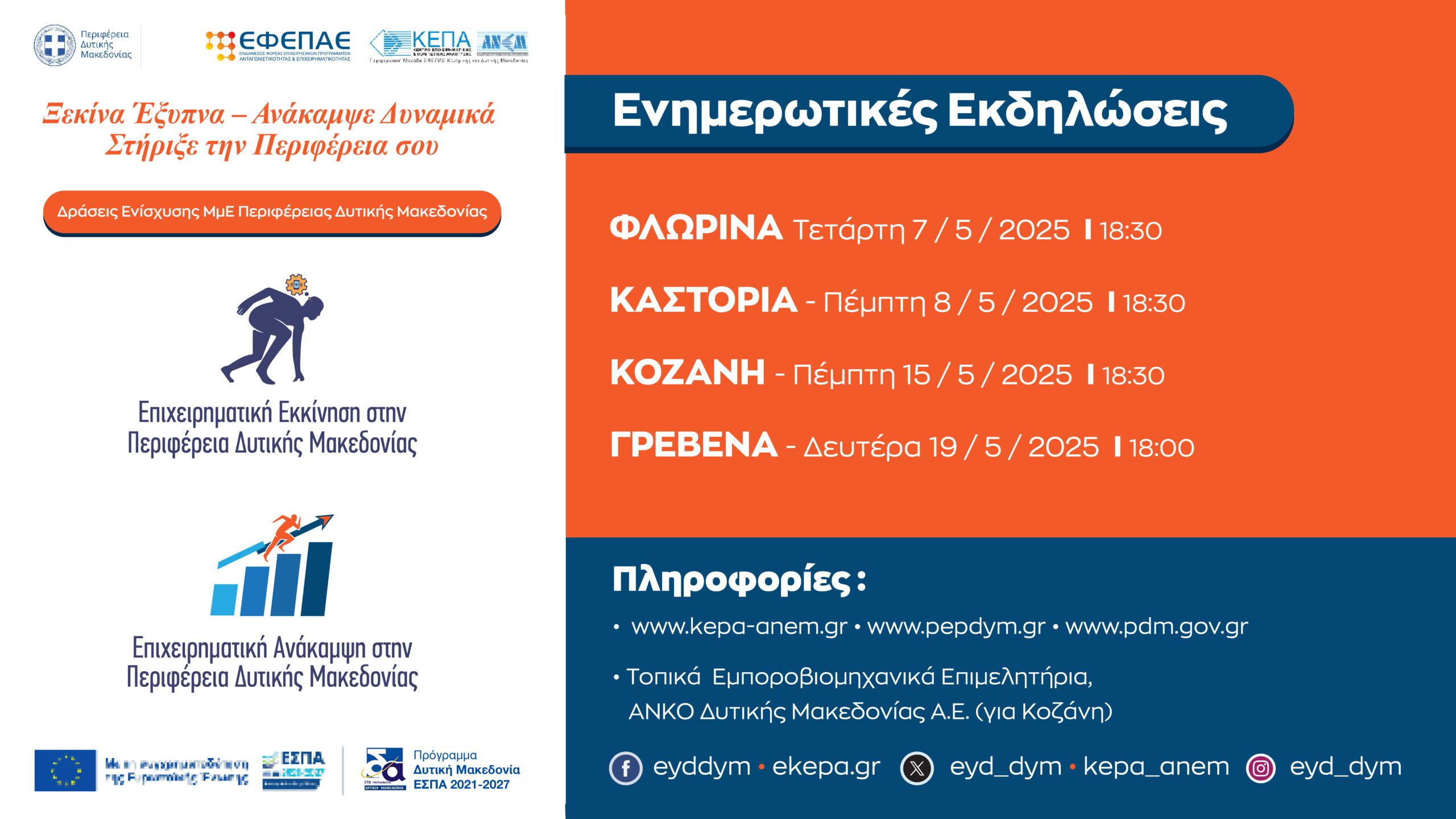 Ενημερωτικές Εκδηλώσεις για τις Δράσεις “Επιχειρηματική Εκκίνηση” και “Επιχειρηματική Ανάκαμψη” του Προγράμματος ΕΣΠΑ «Δυτική Μακεδονία» 2021-2027